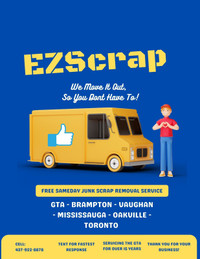 Call 647-856-1214 for details. FREE FAST RELIABLE PICK UP SERVICE for your SCRAP METALS APPLIANCES Electronics and more TEXT 416-274-9505 ITEMS for pick up LOCATION Place in front porch close to garage. We will pick up your unwanted discarded left behind metal objects.